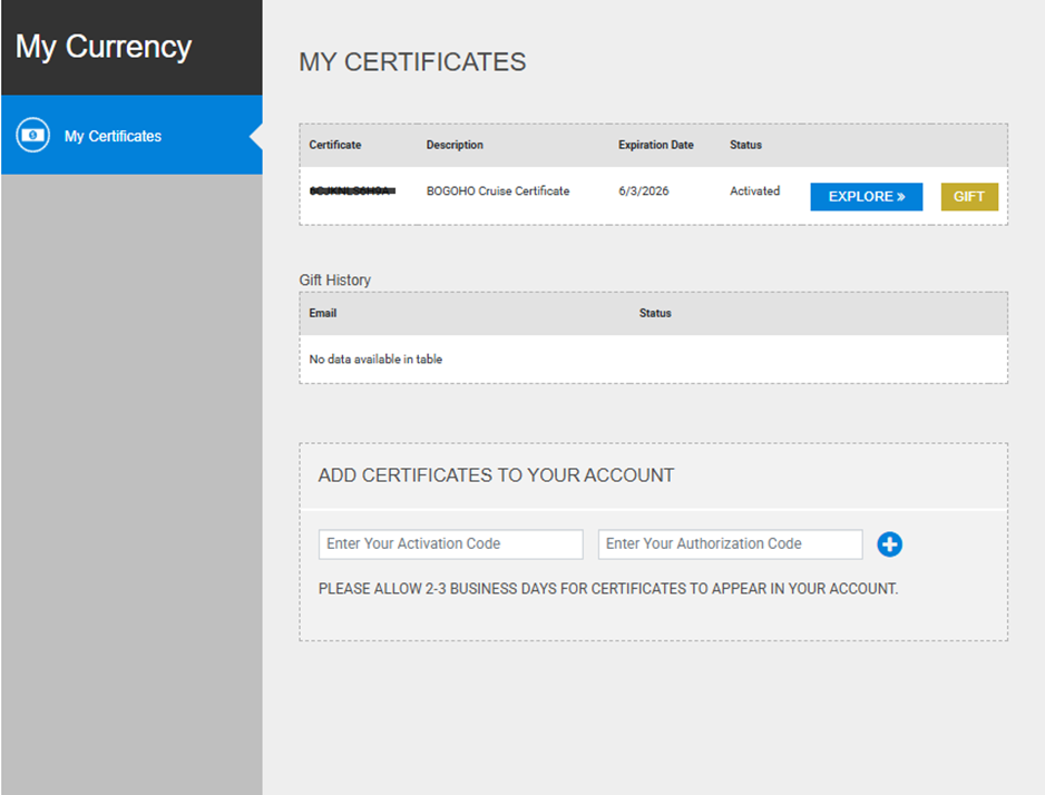 Navigate to your account dashboard and find your active BOGOHO Cruise Certificate.